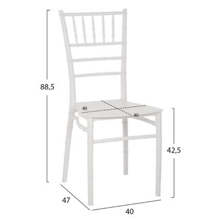 Καρέκλα TIFFANY σε λευκό χρώμα. Ιδανική πρόταση για χρήση σε επαγγελματικούς χώρους (χώροι δεξιώσεων, εταιρείες catering, κλπ.). Η καρέκλα διαθέτει λεπτομέρειες τόσο στις οριζόντιες όσο και στις κάθετες δοκούς της πλάτης, αλλά και στα πόδια. Φυσικά, μια τέτοια καρέκλα είναι και ΣΤΟΙΒΑΖΟΜΕΝΗ πράγμα που την κάνει ιδιαιτέρως πρακτική.