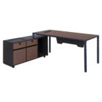 Επαγγελματικό γραφείο με αριστερή γωνία, κατασκευασμένο από μελαμίνη υψηλής ποιότητας, σε γκρι και καρυδί απόχρωση και πόδια αλουμινίου σε σκούρο μπλε χρώμα.