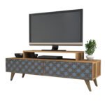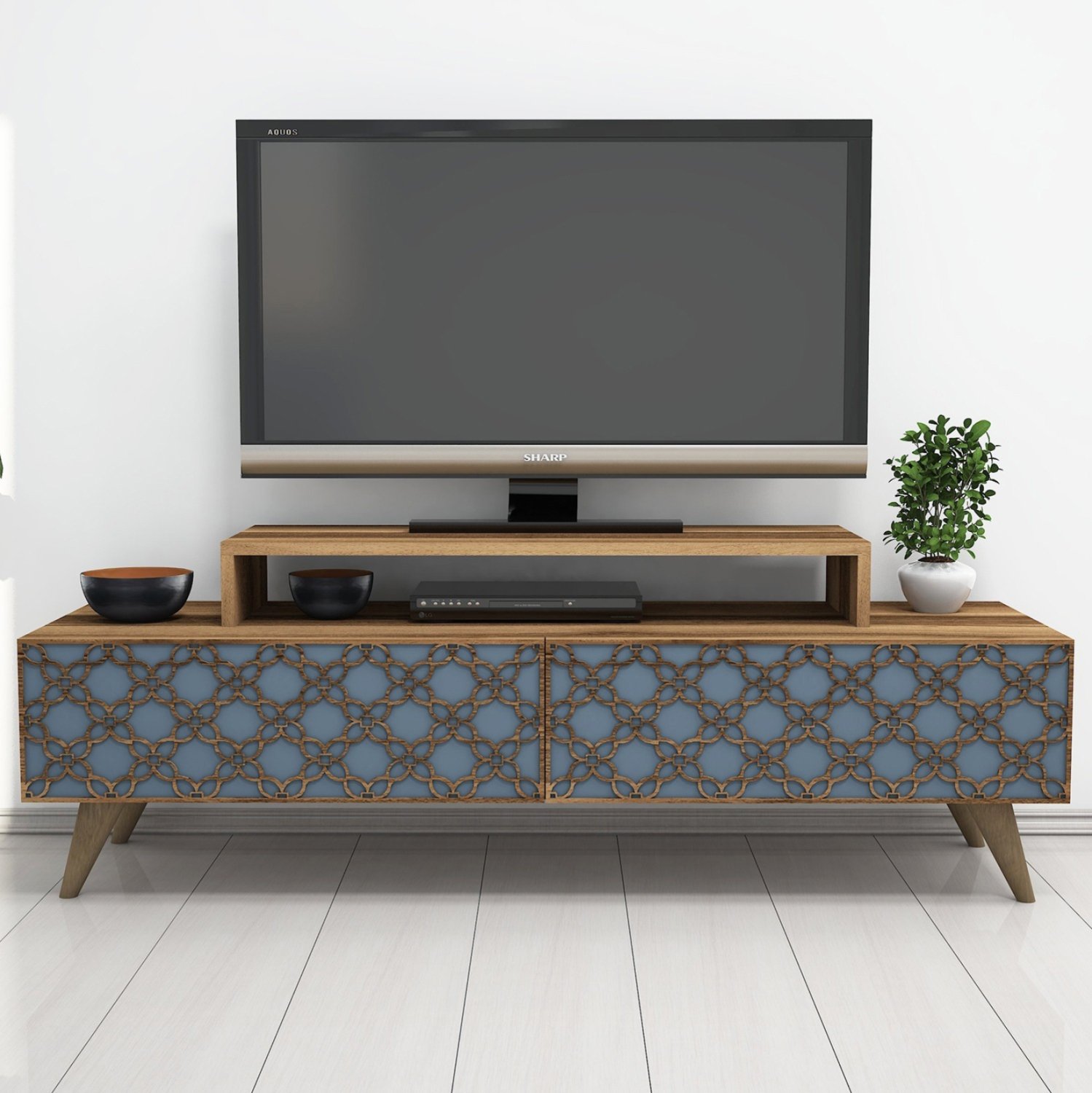 Το ΗΜ9510.02 είναι ένα μοντέρνο και λειτουργικό έπιπλο τηλεόρασης από μελαμίνη σε ΚΑΡΥΔΙ ΚΑΙ ΑΝΟΙΧΤΟ ΓΑΛΑΖΙΟ χρώμα, που θα ομορφύνει το σαλόνι σας! Είναι μακρύ και διαθέτει δύο ισομεγέθη ντουλάπια ως κύριο χώρο αποθήκευσης ή τοποθέτησης αντικειμένων. Η εμπρός όψη των ντουλαπιών, που ανοίγουν κατακόρυφα, είναι διακοσμημένη με μηχανικά κατασκευασμένα (CNC Relief) και όμορφα συμμετρικά σχέδια. Επάνω στην κύρια επιφάνεια υπάρχει ακόμα μια μικρότερη βάση στην οποία τοποθετείται η τηλεόραση ενώ από κάτω υπάρχει χώρος για τοποθέτηση κι άλλων συσκευών. Τα πόδια είναι σχετικά ψηλά. Οι διαστάσεις του επίπλου είναι κατάλληλες για όλες τις τηλεοράσεις εάν θέλετε η τηλεόρασή σας να στηρίζεται σε βάση. Πρόκειται για μια κομψή πρόταση για το σαλόνι σας!