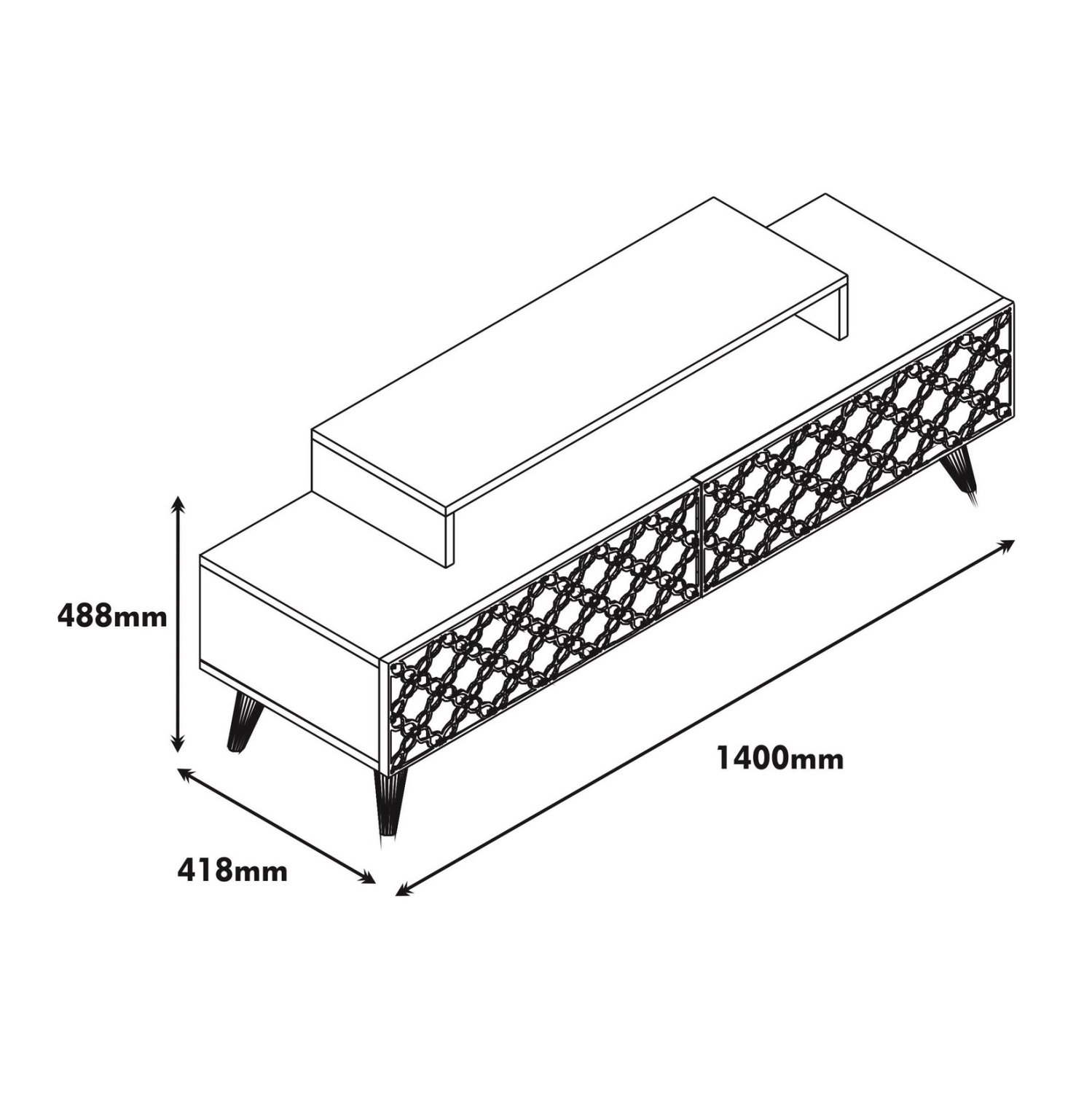 Το ΗΜ9510.01 είναι ένα μοντέρνο και λειτουργικό έπιπλο τηλεόρασης από μελαμίνη σε ΚΑΡΥΔΙ χρώμα, που θα ομορφύνει το σαλόνι σας! Είναι μακρύ και διαθέτει δύο ισομεγέθη ντουλάπια ως κύριο χώρο αποθήκευσης ή τοποθέτησης αντικειμένων. Η εμπρός όψη των ντουλαπιών, που ανοίγουν κατακόρυφα, είναι διακοσμημένη με μηχανικά κατασκευασμένα (CNC Relief) και όμορφα συμμετρικά σχέδια. Επάνω στην κύρια επιφάνεια υπάρχει ακόμα μια μικρότερη βάση στην οποία τοποθετείται η τηλεόραση ενώ από κάτω υπάρχει χώρος για τοποθέτηση κι άλλων συσκευών. Τα πόδια είναι σχετικά ψηλά. Οι διαστάσεις του επίπλου είναι κατάλληλες για όλες τις τηλεοράσεις εάν θέλετε η τηλεόρασή σας να στηρίζεται σε βάση. Πρόκειται για μια κομψή πρόταση για το σαλόνι σας!