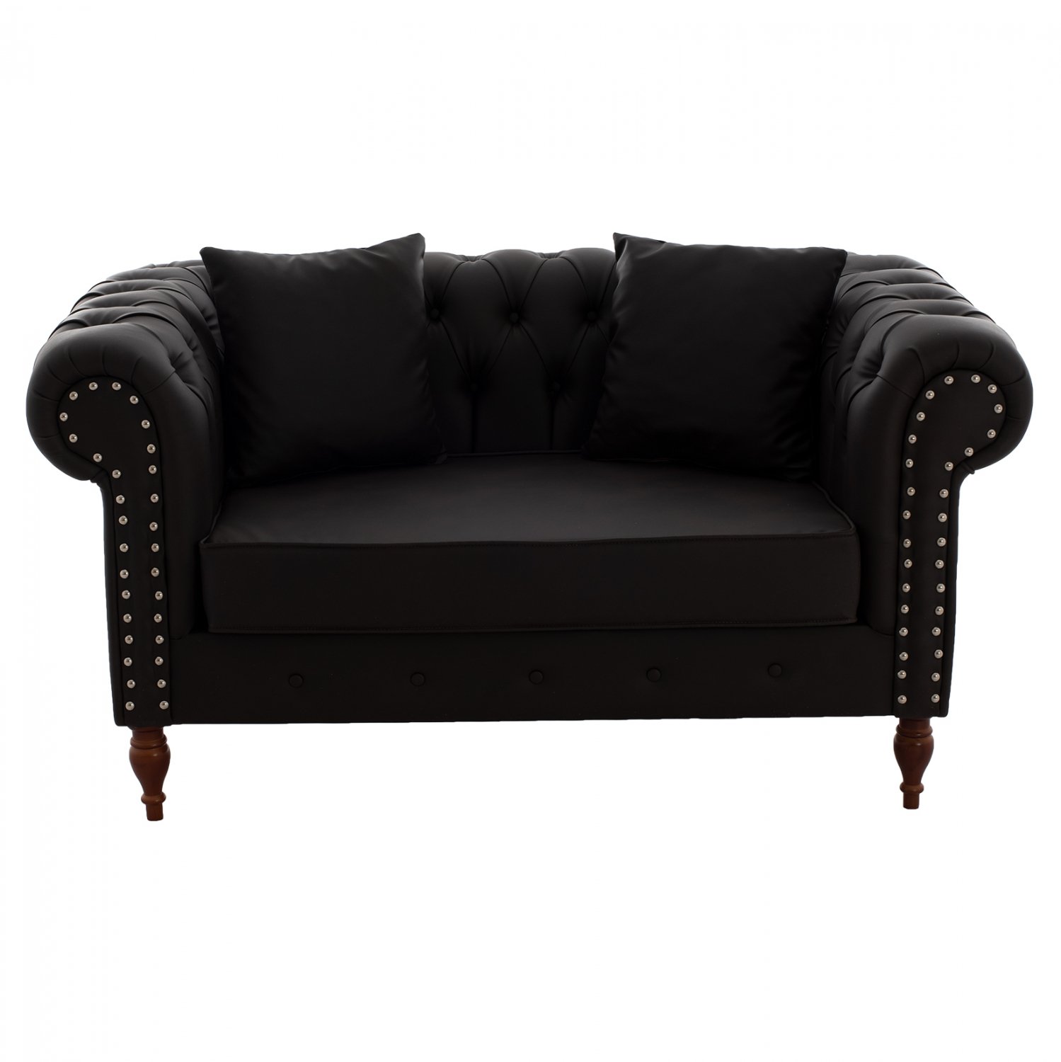 Ο διθέσιος καναπές είναι επενδεδυμένος με τεχνόδερμα υψηλής ποιότητας, καθαρίζεται εύκολα, ενώ διαθέτει ενισχυμένα ξύλινα πόδια σε καρυδί χρώμα, που τον καθιστούν ιδιαίτερα σταθερό και ανθεκτικό.