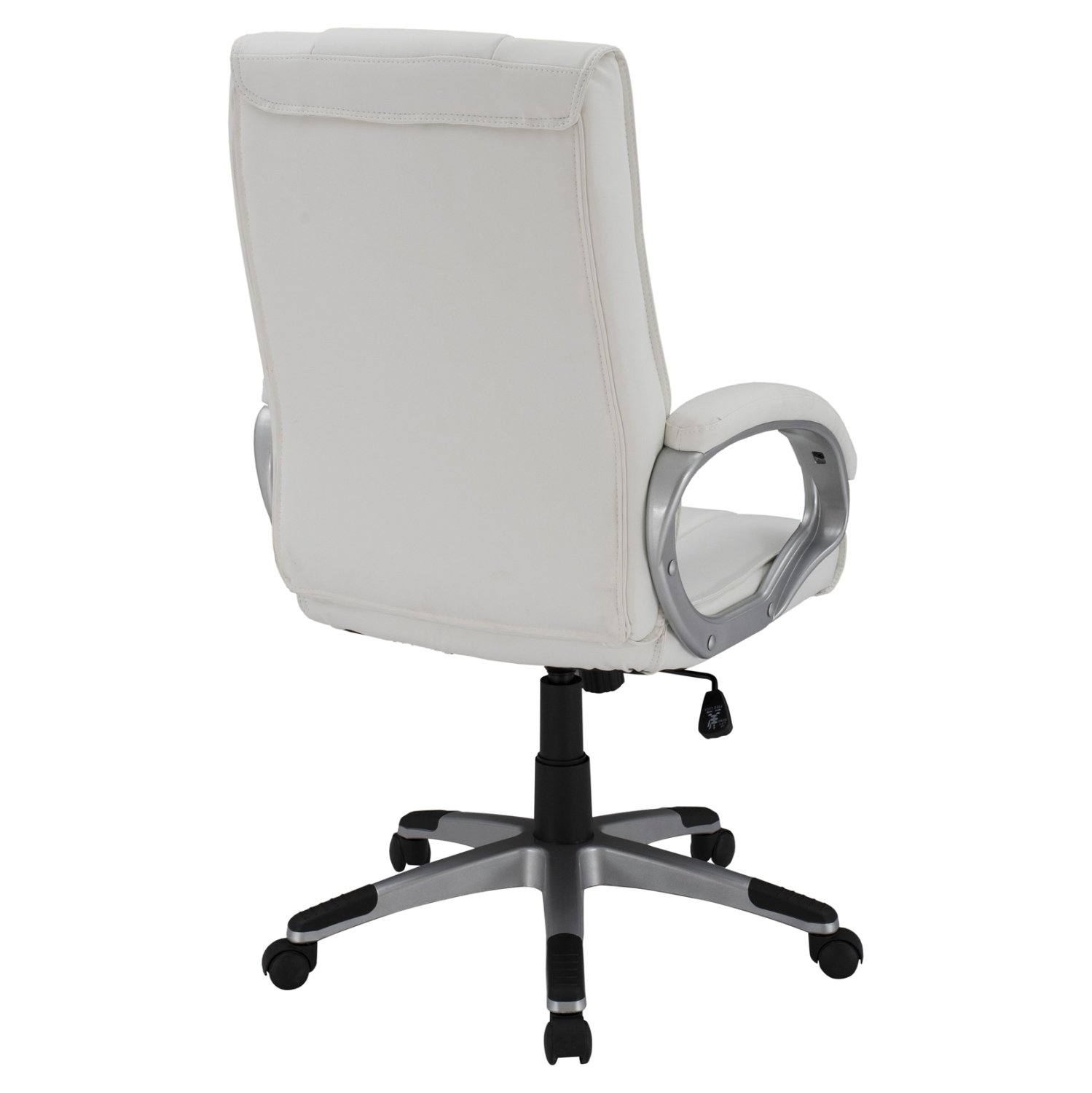 Διευθυντική καρέκλα γραφείου “CHANDER” σε λευκό χρώμα. Μια «πλούσια» καρέκλα γραφείου με ψηλά μπράτσα με κλίση και επενδυμένα με μια λεπτή στρώση αφρολέξ σε PU δέρμα. Η πλάτη είναι ψηλή με πλούσια στρώση από αφρώδη υλικά για άνεση κατά την χρήση και υποστηρίζει ολόκληρο τον κορμό σας, ενώ είναι επενδυμένη με υψηλής ποιότητας PU δέρμα , όπως επίσης και το φαρδύ και αναπαυτικό κάθισμα με την αναπαυτική επιφάνεια. Η βάση είναι ασημί σε σχήμα «αστέρι» με μαύρες λεπτομέρειες στο τελείωμα.