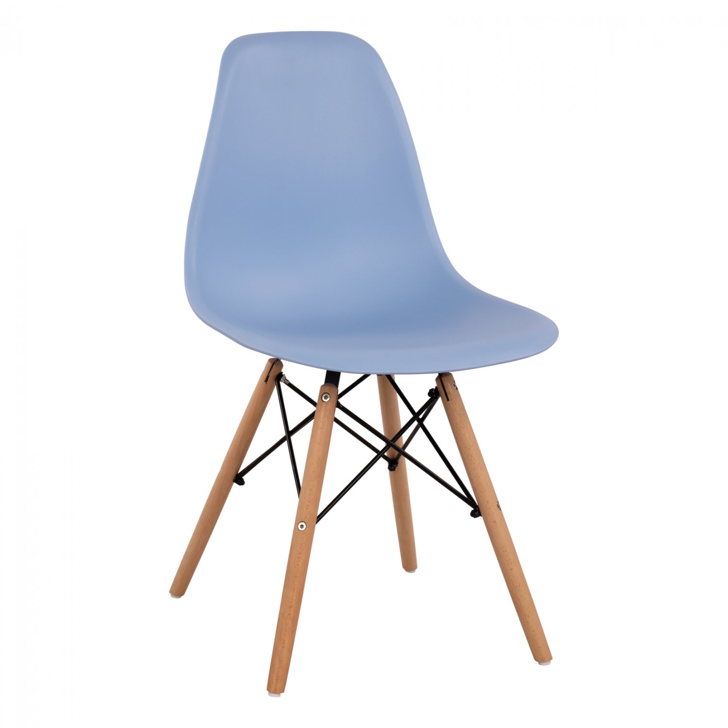 Μία μοντέρνα καρέκλα κατασκευασμένη από ξύλινο σκελετό και κάθισμα πολυπροπυλενίου σε γαλάζια απόχρωση.