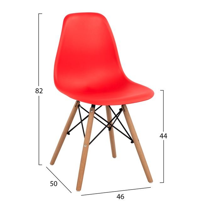 Μία μοντέρνα καρέκλα κατασκευασμένη από ξύλινο σκελετό και κάθισμα πολυπροπυλενίου σε κόκκινη απόχρωση.