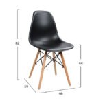 Μία μοντέρνα καρέκλα κατασκευασμένη από ξύλινο σκελετό και κάθισμα πολυπροπυλενίου σε μαύρη απόχρωση.