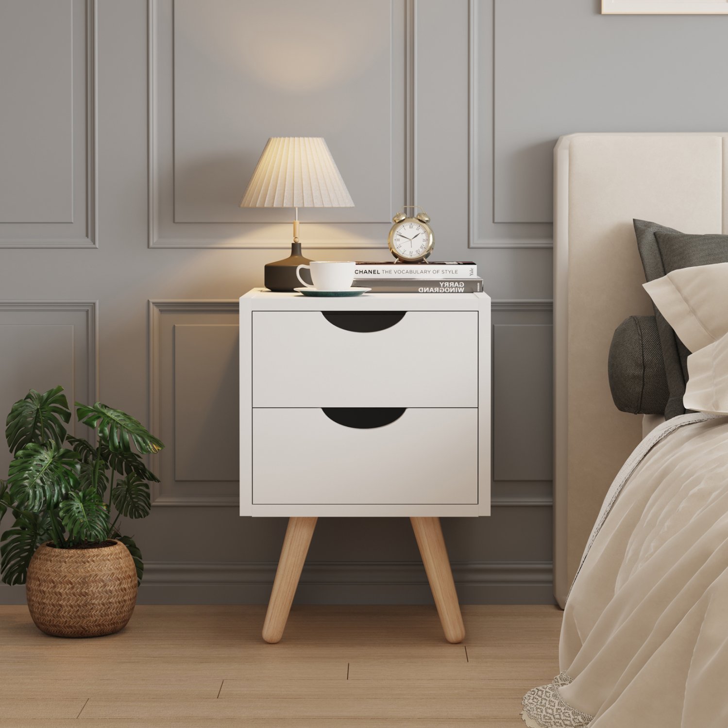 Το κομοδίνο DINKL είναι ένα πρακτικό και όμορφο έπιπλο που θα συνοδεύσει και θα συμπληρώσει με τον καλύτερο τρόπο τον εξοπλισμό του υπνοδωματίου σας. Είναι κατασκευασμένο από ποιοτική μελαμίνη σε ΛΕΥΚΟ χρώμα και διαθέτει 2 συρτάρια με χωνευτά χερούλια. Τα πόδια είναι ψηλά και ξύλινα, και οι διαστάσεις του το καθιστούν ιδανικό ακόμα και για μικρά δωμάτια, ενώ ενδείκνυται τόσο για το σπίτι, όσο και για επαγγελματική χρήση.
