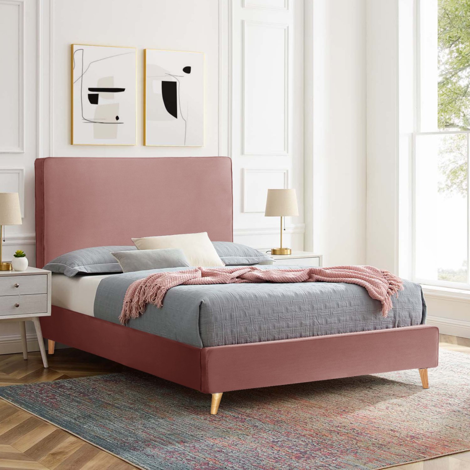 Η επένδυση έχει γίνει εξολοκλήρου από βελούδινο ύφασμα εξαιρετικής ποιότητας, χαρίζοντας ελκυστική όψη και μια εκλεπτυσμένη γοητεία στην διακόσμηση του υπνοδωματίου. Το βελούδο είναι ένα ύφασμα απαλό, χαλαρό, απολαυστικό και φινετσάτο. Παλιά κατασκευαζόταν κυρίως από μεταξωτές ίνες και μάλιστα με μία πολύ ειδική επεξεργασία, που απαιτούσε πολύ χρόνο και ειδικό αργαλειό. Ευτυχώς, σήμερα τα πράγματα έχουν αλλάξει και το υπέροχο αυτό ύφασμα είναι προσιτό για όλους.