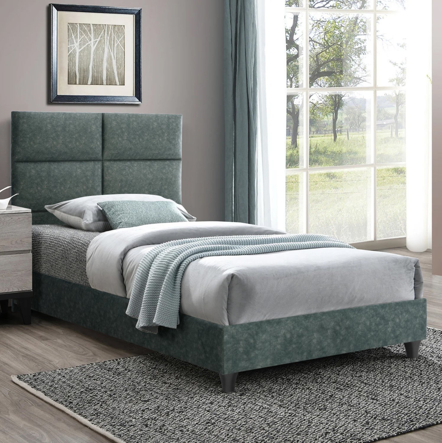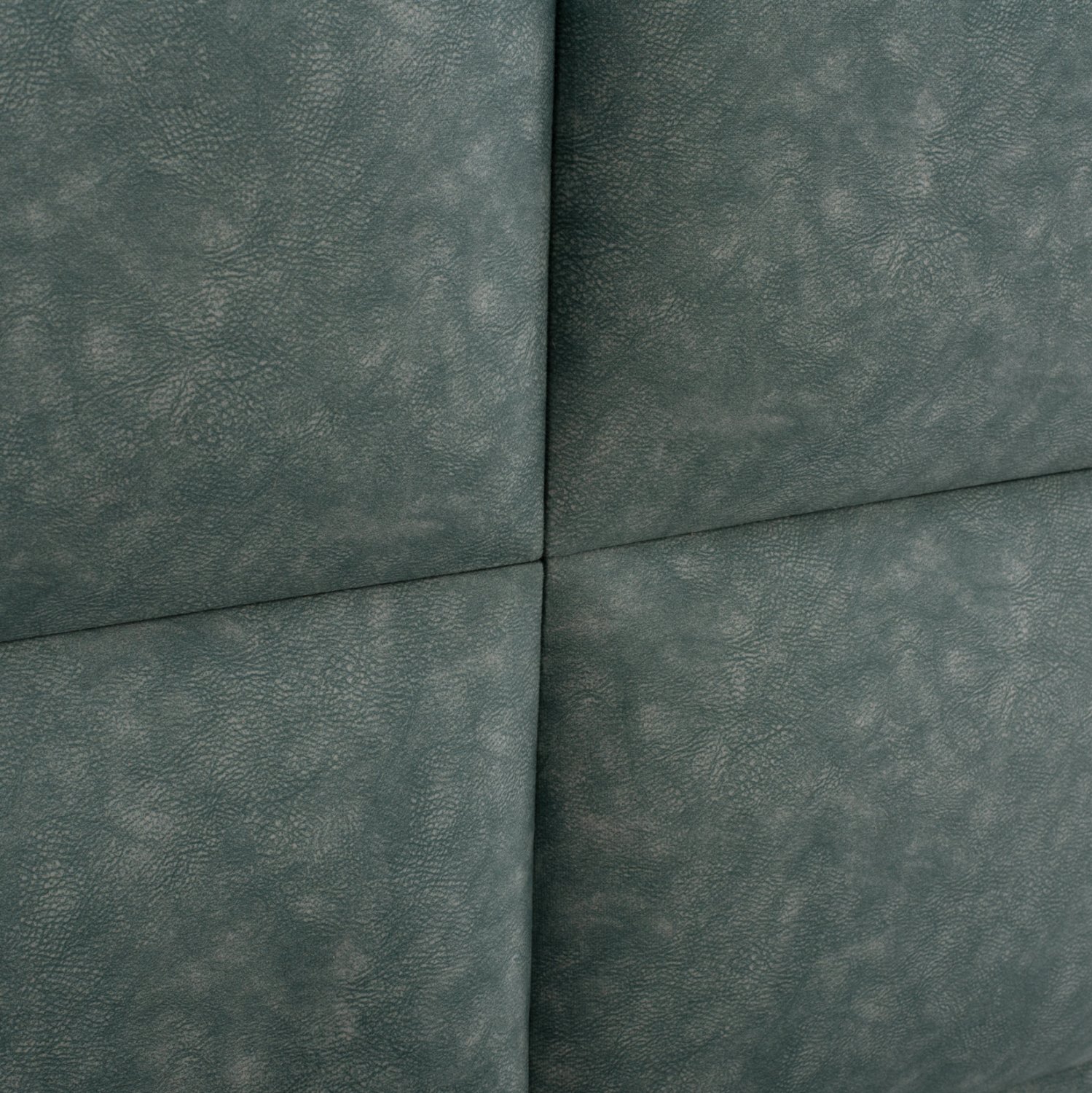 Το κεφαλάρι είναι ψηλό και επενδυμένο με καπιτονέ τεχνοτροπία σε μεγάλα ορθογώνια, ενώ και όλη η επένδυση του κρεβατιού είναι από ανάγλυφο ύφασμα τύπου NUBUCK. Το ΠΡΑΣΙΝΟ χρώμα σε όλο το κρεβάτι είναι όμορφο και μπορεί να συνδυαστεί με πληθώρα διακοσμητικών μοτίβων.