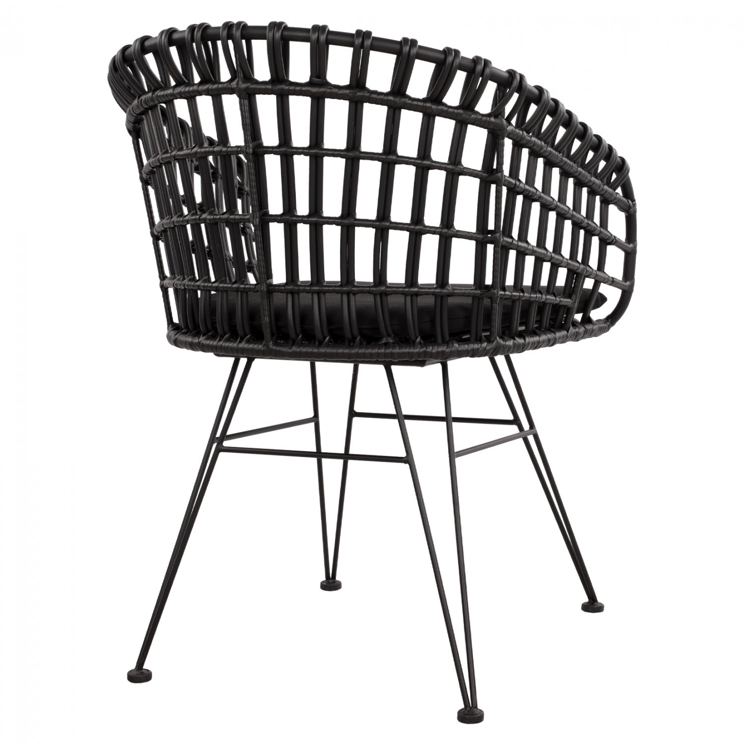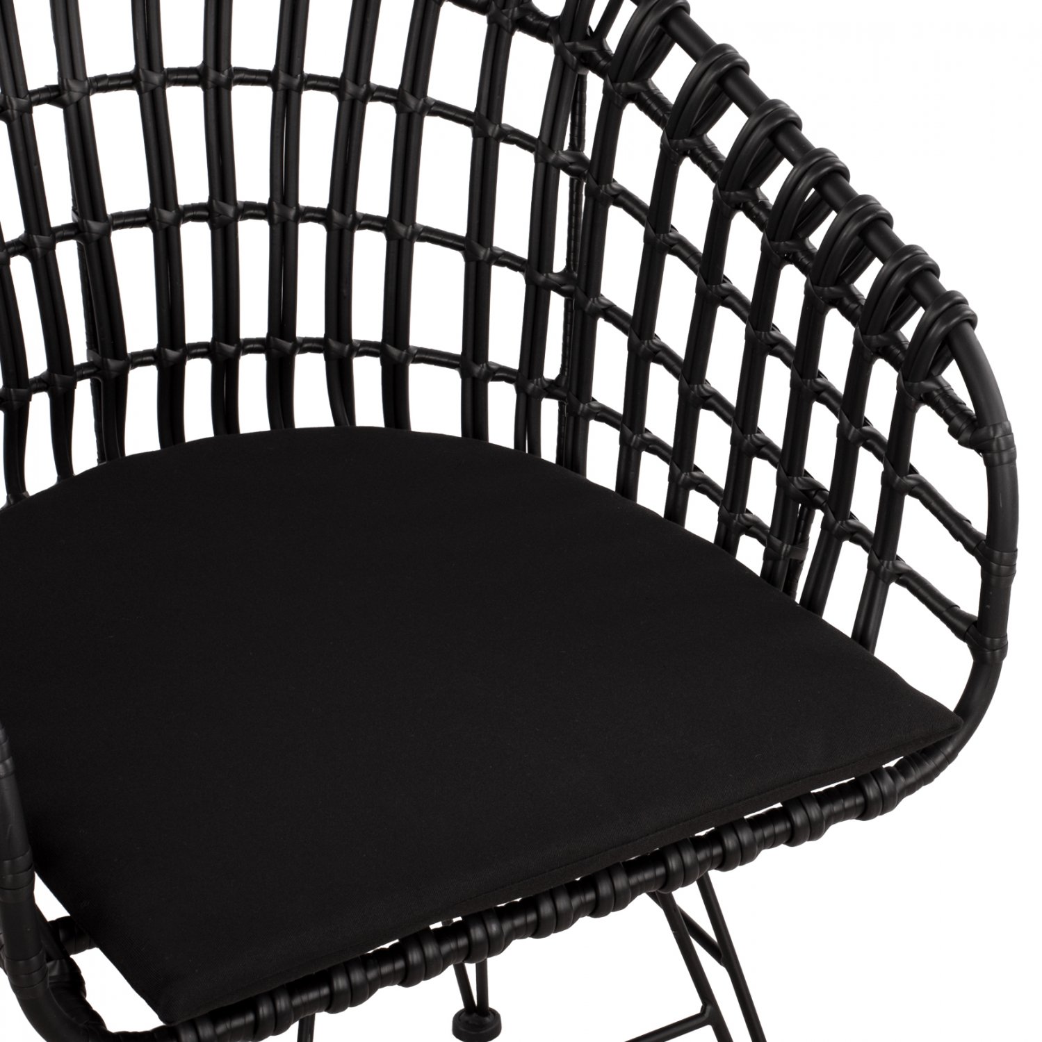Μοντέρνα πολυθρόνα τύπου φωλιά, εξωτερικού αλλά και εσωτερικού χώρου, κατασκευασμένη από μεταλλικό σκελετό σε μαύρη απόχρωση και επενδυμένη με πλεκτό wicker.