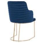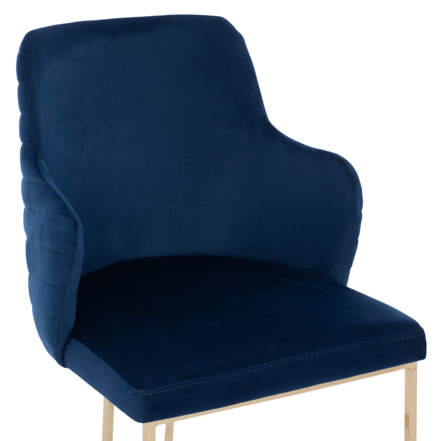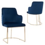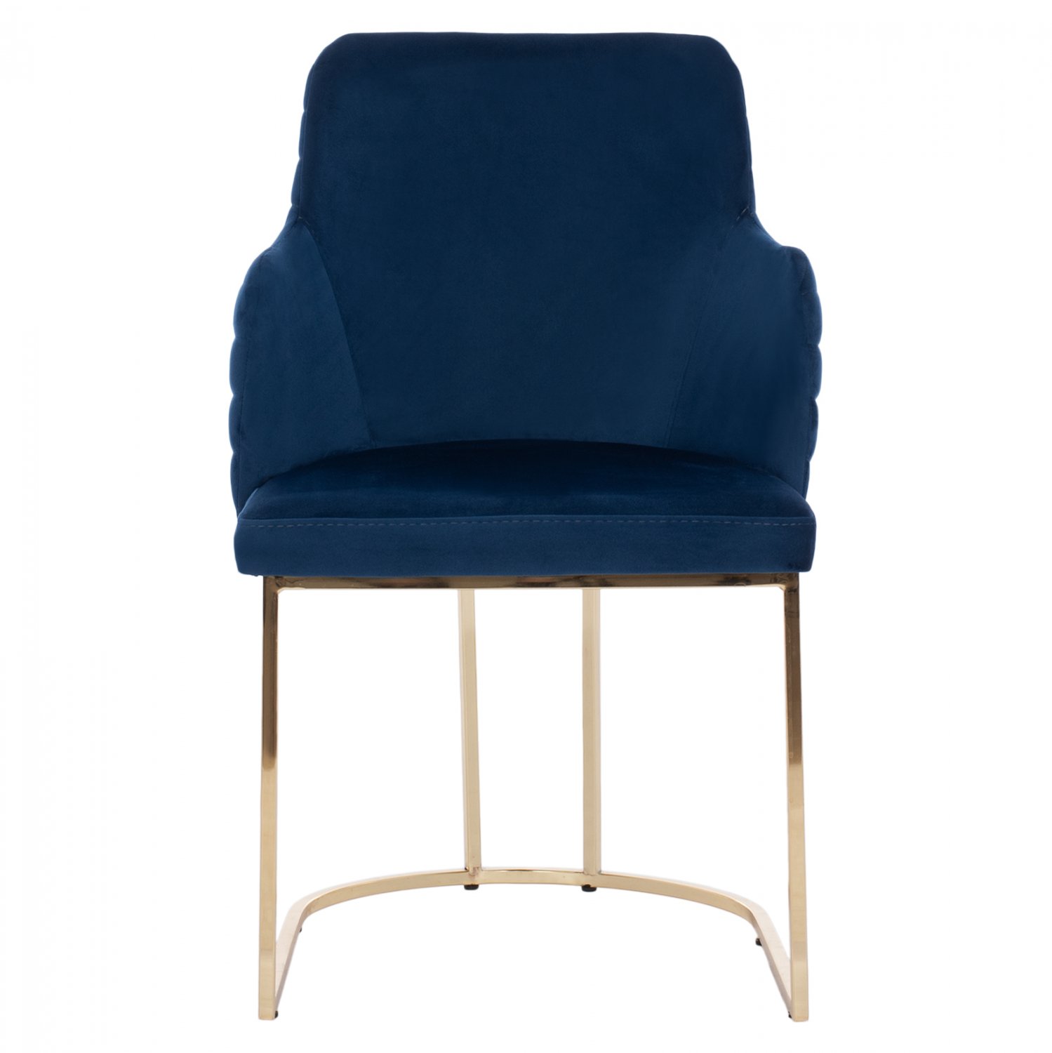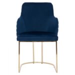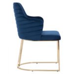 Πολυθρόνα SOLANA σε μπλε χρώμα με μεταλλικά πόδια σε χρυσή απόχρωση. Τα πόδια είναι σε ημικυκλική διάταξη με 4 κάθετα σταθερά πάνω στο μεταλλικό ημικύκλιο. Μια πολυθρόνα που δίνει κάτι το ξεχωριστό σε οποιοδήποτε επαγγελματικό χώρο. Λιτή, ποιοτική και κομψή σίγουρα θα τραβήξει τα βλέμματα. Το εξωτερικό της μεσαίου ύψους πλάτης φέρει οριζόντιες ραφές στην βελούδινη επένδυση, πράγμα που επιτείνει τον ιδιαίτερο χαρακτήρα αυτής της πολυθρόνας.