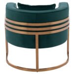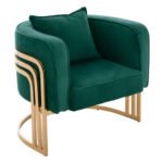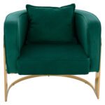 Η πολυθρόνα ΤΙΑΝΑ είναι μια πανέμορφη πολυθρόνα σε κυπαρισσί χρώμα και μεταλλικό σκελετό σε χρυσό χρώμα. Ο σκελετός καταλήγει στα πόδια της πολυθρόνας που είναι σε ημικυκλική διάταξη βάσης με 3 κάθετα σταθερά πάνω στο μεταλλικό ημικύκλιο. Μια καρέκλα που δίνει κάτι το ξεχωριστό σε οποιοδήποτε επαγγελματικό χώρο. Ξεχωριστή, ποιοτική και κομψή σίγουρα θα τραβήξει τα βλέμματα. Η πλάτη είναι χαμηλή αλλά συνοδεύεται από ένα μαλακό μαξιλάρι, ενώ όλη η πολυθρόνα έχει βελούδινη επένδυση με ρέλι στις ραφές, πράγμα που επιτείνει τον ιδιαίτερο χαρακτήρα αυτής της πολυθρόνας.