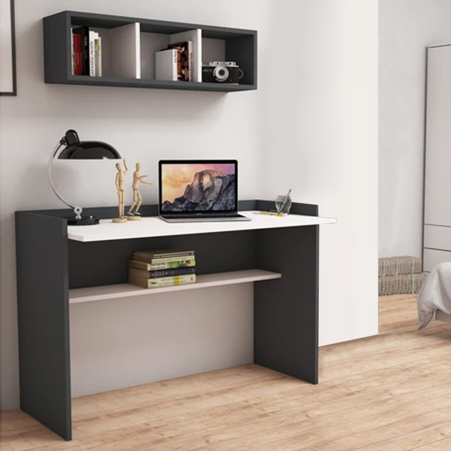 Σετ γραφείου με κομψό και λιτό σχεδιασμό, αποτελούμενο από γραφείο και ραφιέρα τοίχου, κατασκευασμένα από ανθεκτική μελαμίνη πάχους 18 χιλιοστών υψηλής ποιότητας, σε γκρι απόχρωση με λευκές λεπτομέρειες.