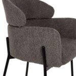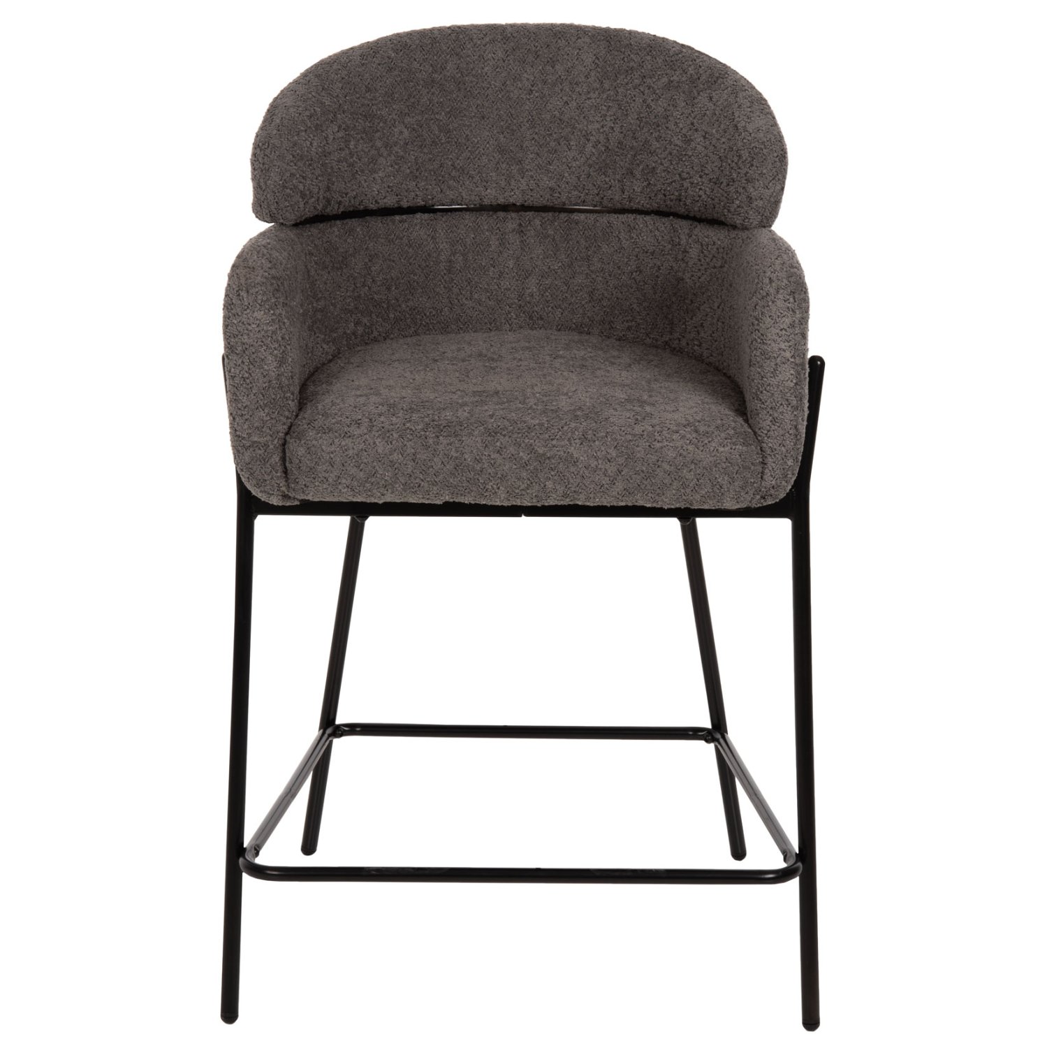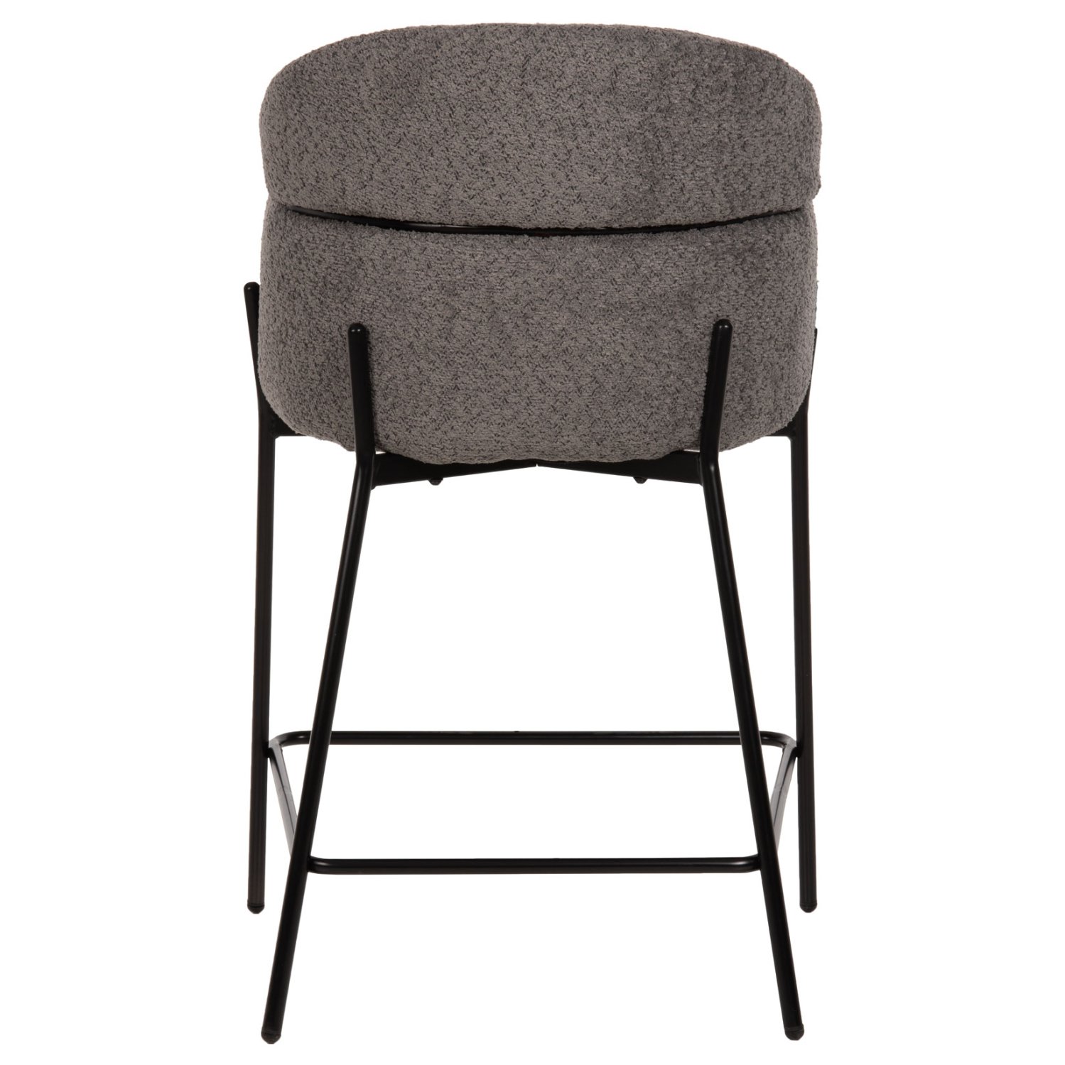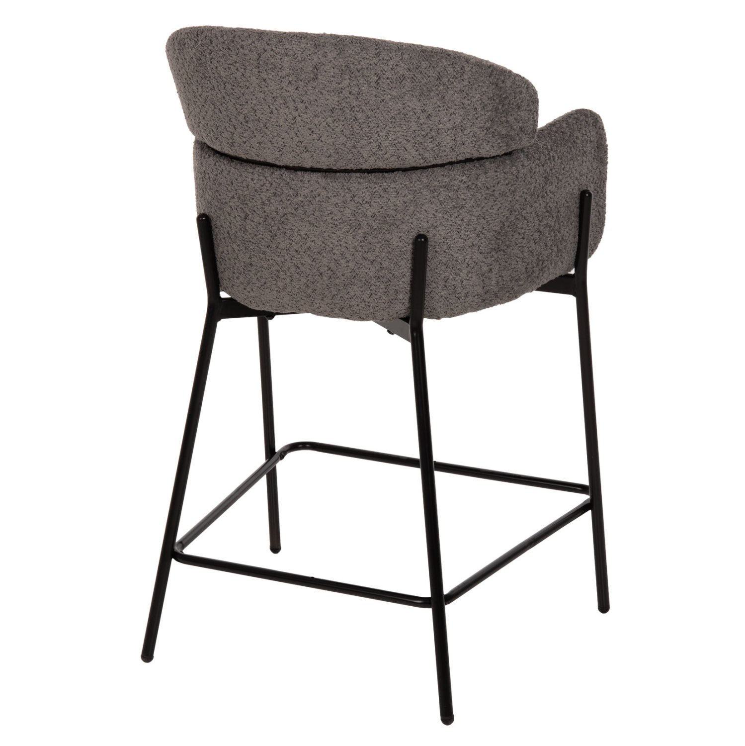 Επαγγελματικό σκαμπό bar WOLF σε ΓΚΡΙ χρώμα με ΜΑΥΡΑ μεταλλικά πόδια. Τα πόδια ενώνονται μεταξύ τους περίπου στη μέση τους με μια μεταλλική ράγα. Το σκαμπό είναι λιτό, ποιοτικό και κομψό στην όψη, και σίγουρα τραβάει τα βλέμματα με το ύφασμα μπουκλέ που είναι επενδυμένο. Είναι μεσαίου ύψους με πλάτη η οποία αγκαλιάζει το σώμα ενώ διαθέτει σχετικά ψηλά μπράτσα, πράγμα που επιτείνει τον αναπαυτικό χαρακτήρα αυτού του σκαμπό.