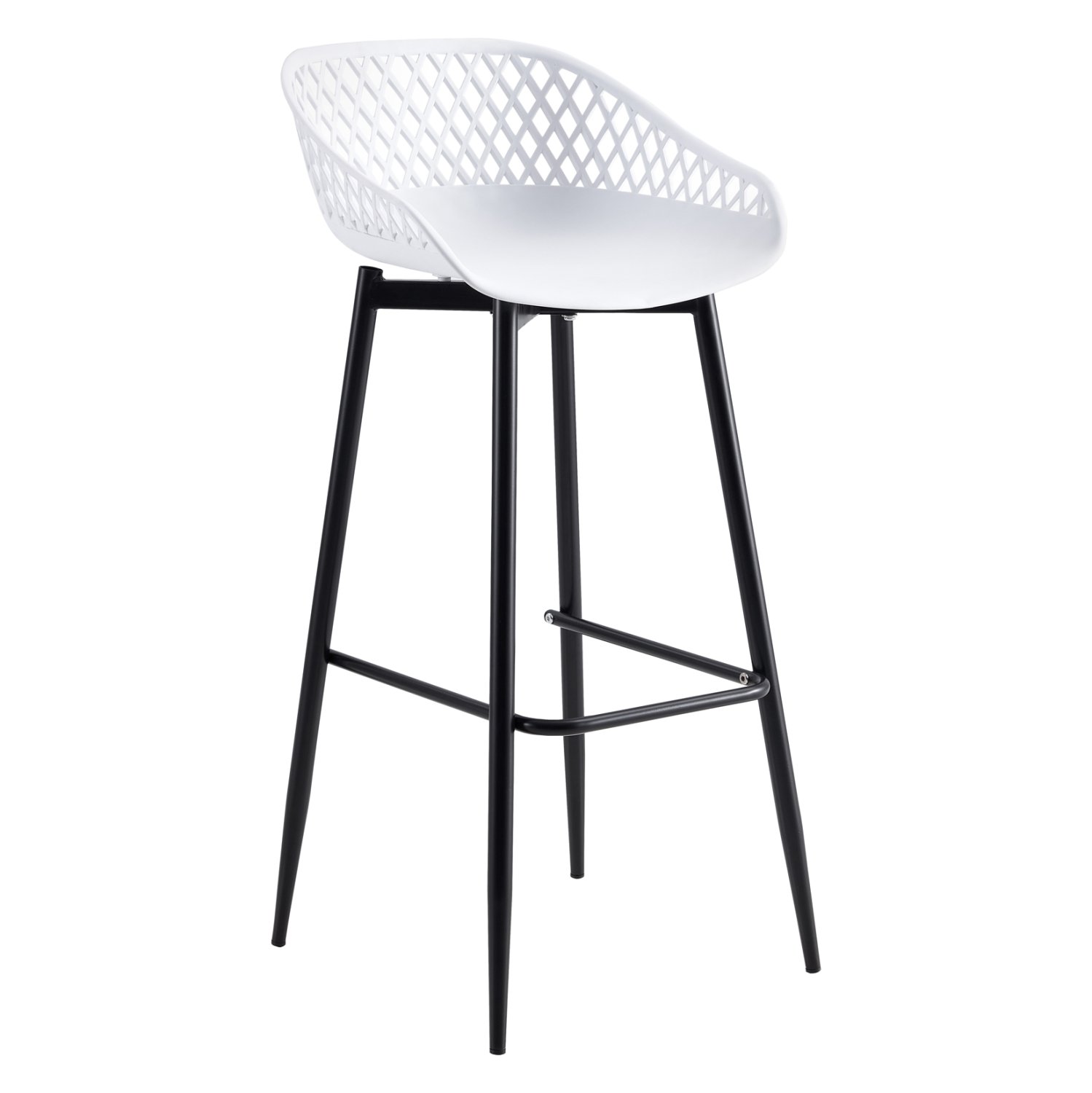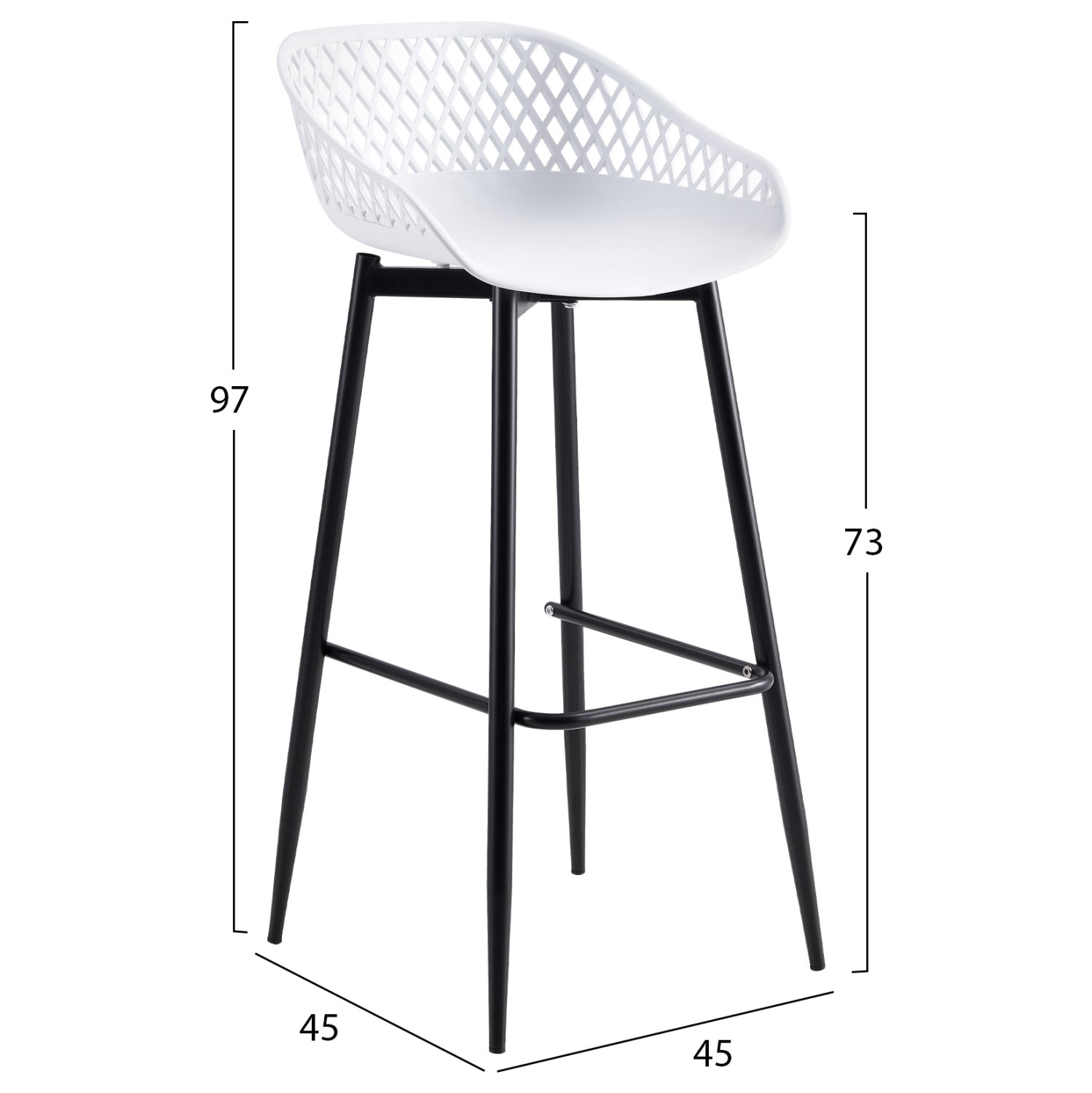 Το σκαμπό μπαρ AVAYA είναι κατασκευασμένο από πολυπροπυλένιο σε ΛΕΥΚΗ απόχρωση, με ΜΑΥΡΑ μεταλλικά πόδια.