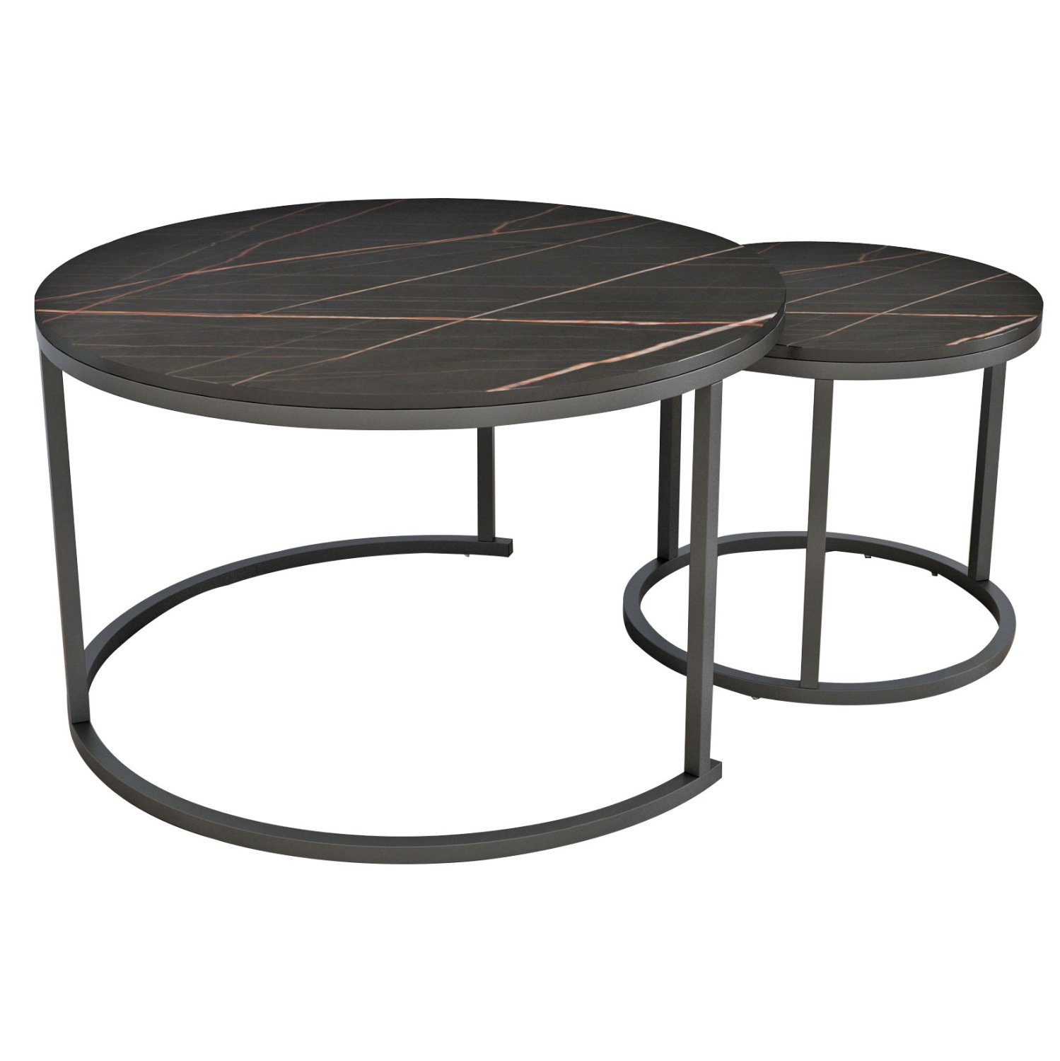 ΗΜ8763.13 τραπεζάκια σαλονιού—– Τα τραπεζάκια ΗΜ8763.13 θα σας ενθουσιάσουν με το στυλ και την πρακτικότητά τους. Πρόκειται για 2 τραπεζάκια ένα ψηλότερο κι ένα πιο κοντό με ιδιαίτερο χαρακτηριστικό ότι το ψηλότερο στηρίζεται σε μια ημικυκλική βάση με τρία μεταλλικά πόδια, πράγμα που επιτρέπει στο πιο κοντό να χωράει και να αποθηκεύεται ακριβώς από κάτω. Οι βάσεις και των δύο τραπεζιών είναι μεταλλικές σε μαύρο χρώμα, ενώ οι επιφάνειές τους είναι σε απομίμηση μαύρου μαρμάρου από MDF.