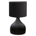 Επιτραπέζιο φωτιστικό σε μαύρο χρώμα με «τύμπανο» επίσης σε μαύρο χρώμα. Ένα όμορφο φωτιστικό που θα δημιουργήσει την ατμόσφαιρα που πάντα φανταζόσασταν για τον χώρο σας. Το υφασμάτινο «τύμπανο» προσφέρει στον χώρο σας στιγμιαία στυλιστική αναβάθμιση. Ειδικά, το μαύρο χρώμα του «τύμπανου» πραγματικά δίνει την εντύπωση της πολυτέλειας χωρίς όριο. Το σώμα του φωτιστικού είναι σε καλαίσθητο σχήμα μισής μπουκάλας και ο συνδυασμός με το «τύμπανο» δημιουργεί μια οικεία εικόνα που θα σας χαλαρώσει μετά από μια έντονη μέρα. Αυτού του είδους τα φωτιστικά δεν προορίζονται για φωτιστικά διαβάσματος και αυτό πρέπει πάντα να λαμβάνεται υπόψη κατά την επιλογή τους. Είναι καθαρά διακοσμητικά και το ταίριασμά τους με τον περιβάλλοντα χώρο θα πρέπει να είναι αρμονικό. Αυτό το φωτιστικό είναι λιτό, κομψό και βολικό σε διαστάσεις παρέχοντας αμέτρητες δυνατότητες «δεσίματος» με την υπόλοιπη διακόσμησή σας. Είναι ένα μικρό έργο τέχνης.