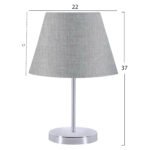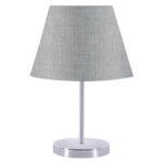Μοντέρνο επιτραπέζιο φωτιστικό με κυκλική βάση και κολώνα χρωμιωμένα, και ανοιχτό γκρι υφασμάτινο τραπεζοειδές καπέλο. Πρόκειται για διακοσμητικό φωτιστικό, σε απλή και λιτή γραμμή. Το φως διαχέεται στον χώρο ευχάριστα και η αντανάκλασή του πάνω στην χρωμιωμένη κολωνίτσα του φωτιστικού αλλά και στην χρωμιωμένη επιφάνεια της βάσης, παιχνιδίζει ευχάριστα στο μάτι. Αυτού του είδους τα φωτιστικά δεν προορίζονται για φωτιστικά διαβάσματος και αυτό πρέπει πάντα να λαμβάνεται υπόψη κατά την επιλογή τους. Είναι καθαρά διακοσμητικά και το ταίριασμά τους με τον περιβάλλοντα χώρο θα πρέπει να είναι αρμονικό. Αυτό το φωτιστικό είναι κομψό και βολικό σε διαστάσεις παρέχοντας αμέτρητες δυνατότητες «δεσίματος» με την υπόλοιπη διακόσμησή σας. Είναι ένα μικρό έργο τέχνης.