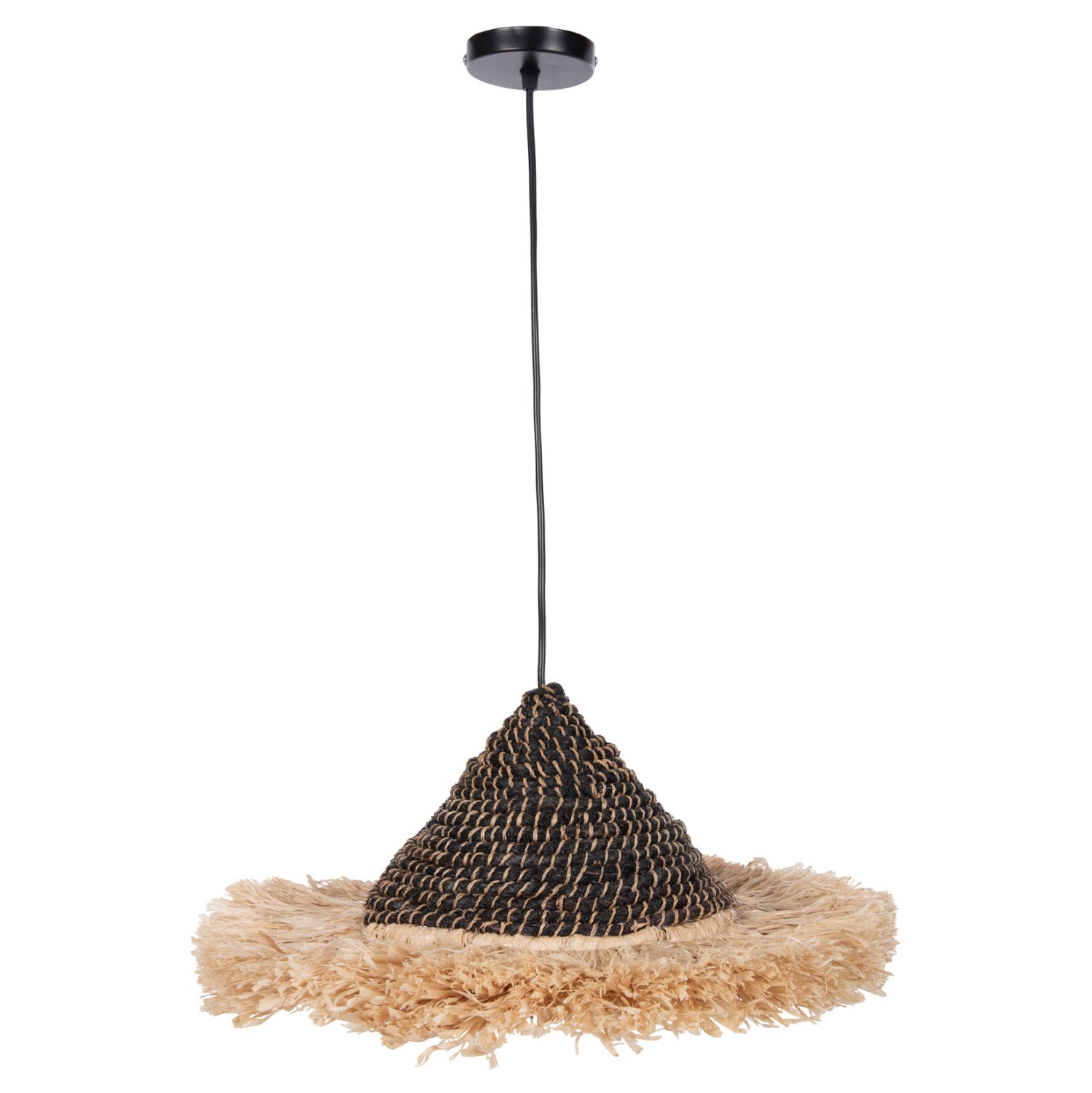 Hm7789- Kρεμαστό φωτιστικό—- Αν επιθυμείτε να διακοσμήσετε το χώρο σας με ένα φωτιστικό σε boho στυλ με εξωτικά υλικά, αυτό είναι μια χαρακτηριστική επιλογή. Είναι ένα μονόφωτο με «καπέλο» φτιαγμένο από φουντωτές ίνες σιζάλ σε φυσικό χρώμα και ανακυκλωμένες ίνες κάνναβης Μανίλας σε μαύρο χρώμα.