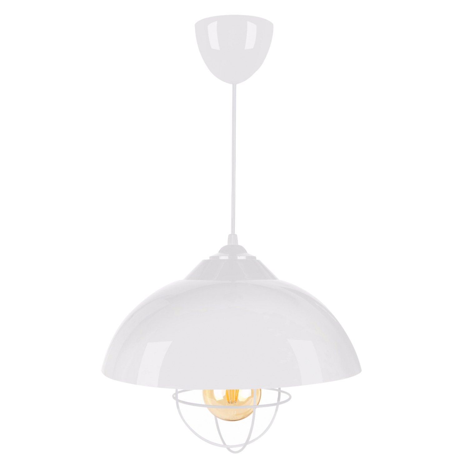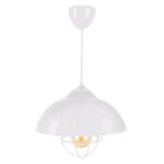 Μονόφωτο κρεμαστό φωτιστικό βιομηχανικού τύπου. Παραδοσιακός σχεδιασμός ενός απλού σχήματος «μανιταριού» με την λάμπα να προεξέχει από το «μανιτάρι» και να βρίσκεται σε μεταλλικό πλέγμα. Το design παραπέμπει στον εργοστασιακό φωτισμό των αρχών του 20ου αιώνα, ο οποίος μπορεί να ηρεμήσει την ένταση του γρήγορου τρόπου ζωής μας, επανασυνδέοντάς μας με τις παλιές καλές εποχές. Όλο το φωτιστικό είναι σε λευκό χρώμα.