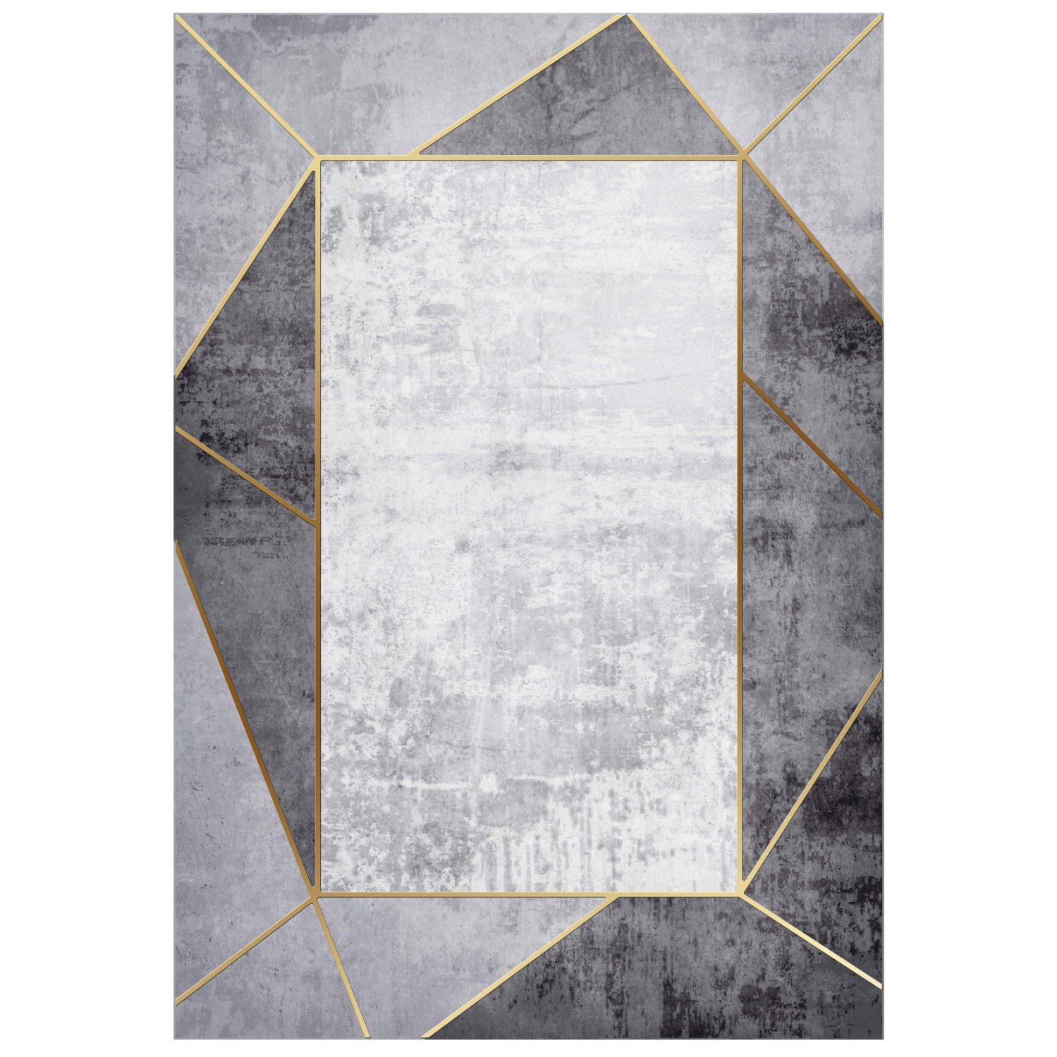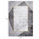 Αυτό το μοντέρνο χαλί έχει κυρίαρχα χρώματα το άσπρο, το γκρι σε δύο αποχρώσεις, και το χρυσό στις γραμμές. Το έντονο χαρακτηριστικό του είναι το λευκό ορθογώνιο στο κέντρο του χαλιού που μοιάζει με καθρέφτη με χρυσό πλαίσιο. Ένα μοντέρνο χαλί που θα τραβήξει τα βλέμματα και θα αναβαθμίσει αισθητικά το σαλόνι σας.