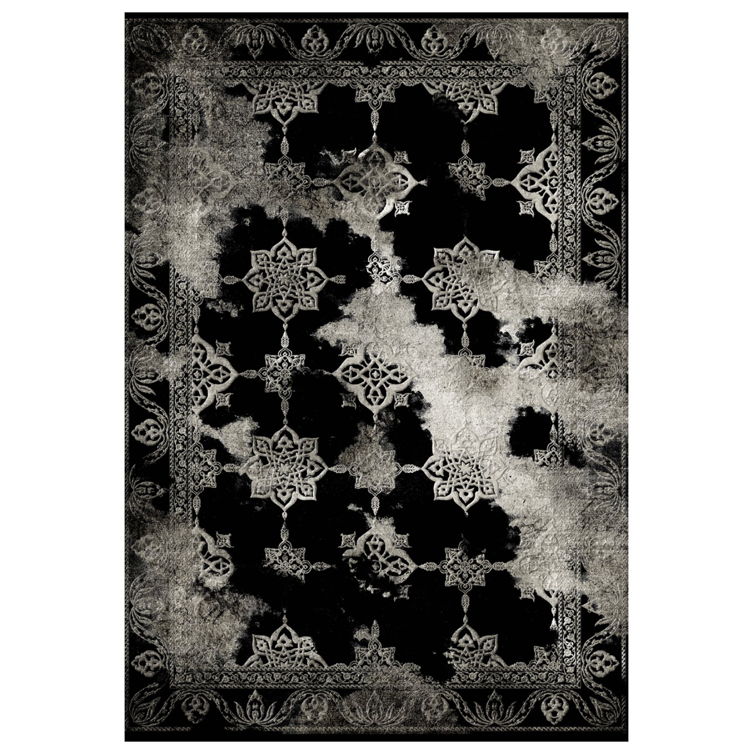 Αυτό το χαλί έχει κυρίαρχο χρώμα φόντου το ΜΑΥΡΟ, με ευδιάκριτη λουλουδάτη μπορντούρα αλλά και ευδιάκριτα σχέδια στο κέντρο παρά το γεγονός ότι το γενικότερο στυλ του χαλιού παραπέμπει σε ξεβαμμένη τοιχογραφία και σίγουρα θα αποτελέσει αντικείμενο συζητήσεων στο σαλόνι σας. Άλλωστε, η γοητεία πού ασκεί το χαλί είναι τόσο δυνατή, πού κανένα δεν αφήνει αδιάφορο. Δίνει μοντέρνα όψη χωρίς υπερβολές, «παντρεύοντας» ένα κλασικό σχέδιο με το «ξεβαμμένο» στυλ.